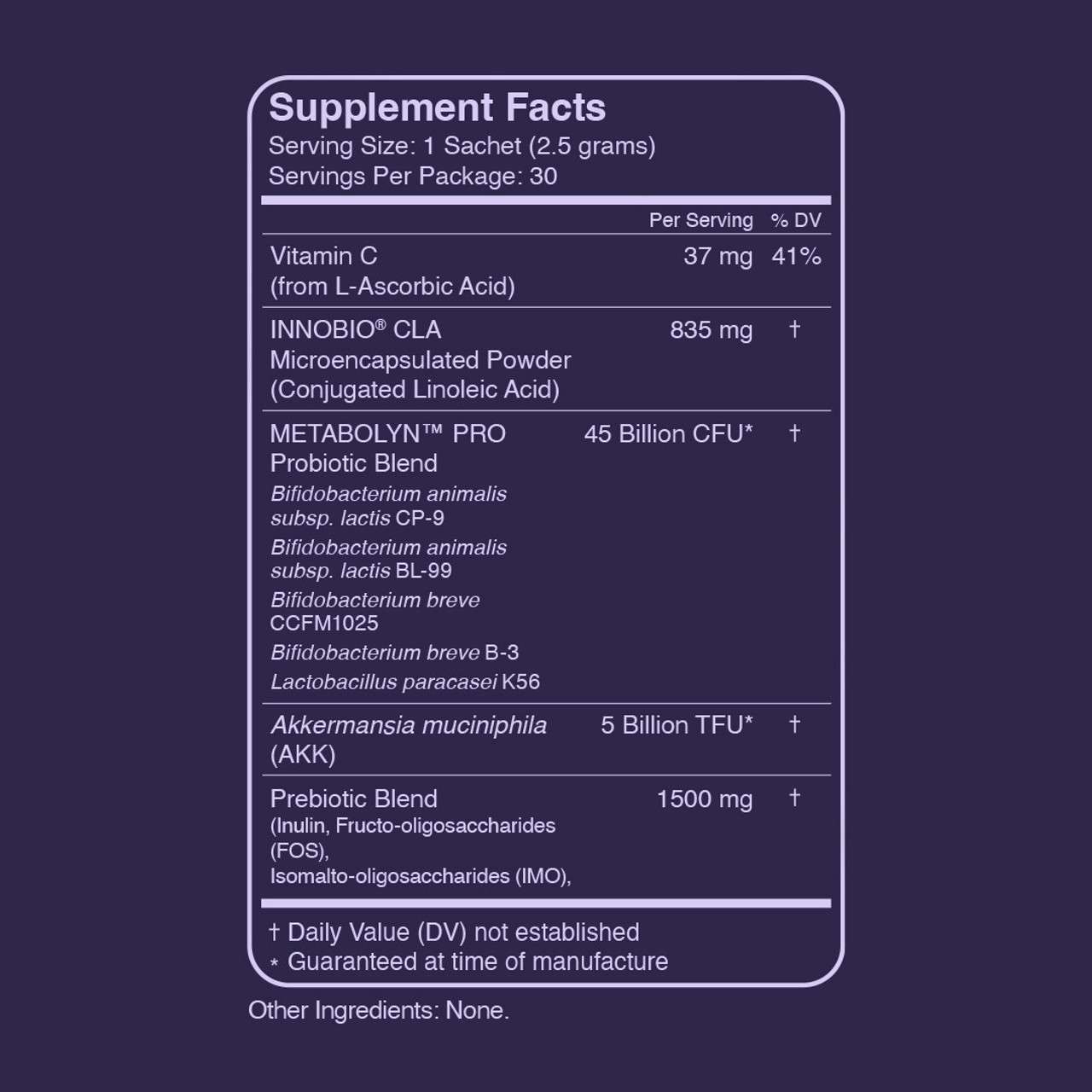 Formulated with probiotic AKK plus 5 unique, multi-patented ‘crown’ strains, (CLA) and prebiotics. This advanced formula is powered by metabolic research to support a balanced gut microbiome and healthy metabolic function, digestion, mood and overall wellbeing. Delivers real, research-backed results.