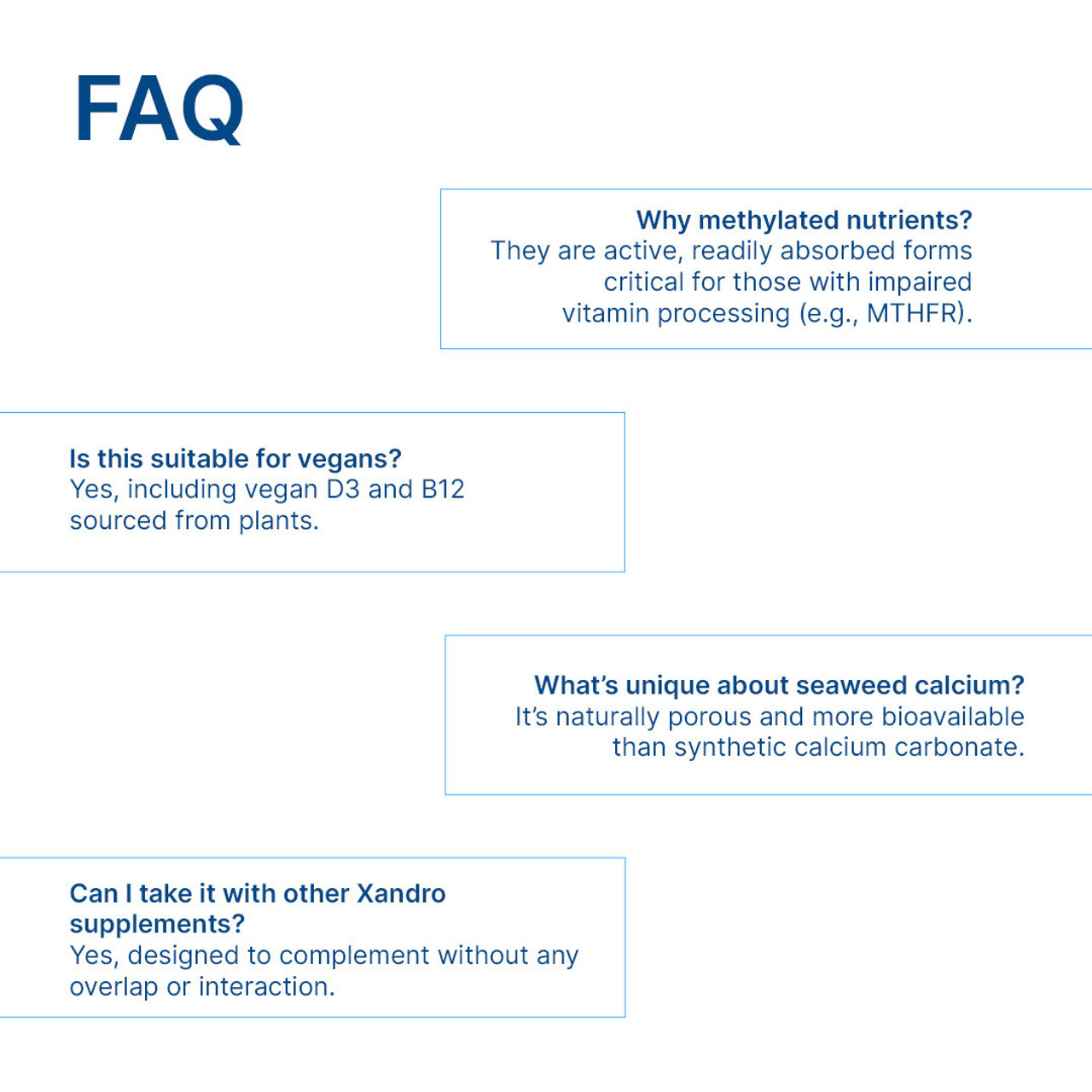 The formula is intentionally free of herbal extracts, fillers, and non-essential additives, focusing on clinically validated, bioactive nutrients that the body can readily use. It is also vegan-friendly, with plant-based vitamin D3, B12, and seaweed-derived calcium.
