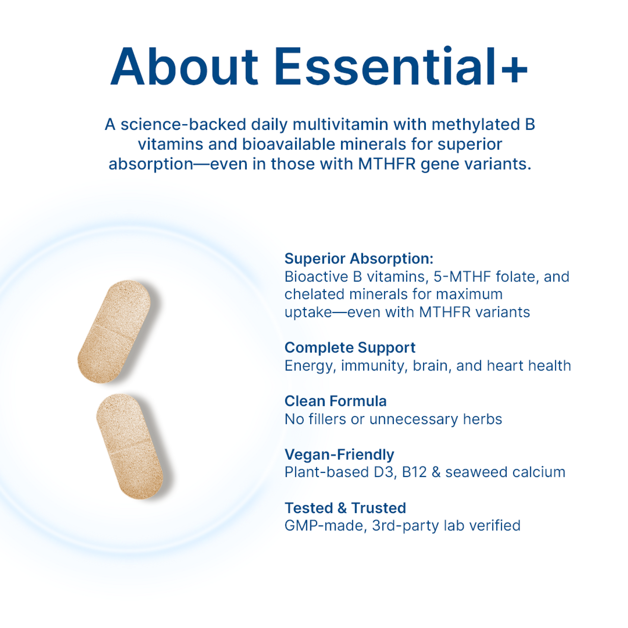 Essential+ uses 5-MTHF (5-methyltetrahydrofolate) — the biologically active form of folate (vitamin B9); and not synthetic folic acid. This allows for superior absorption, and plays a vital role in: