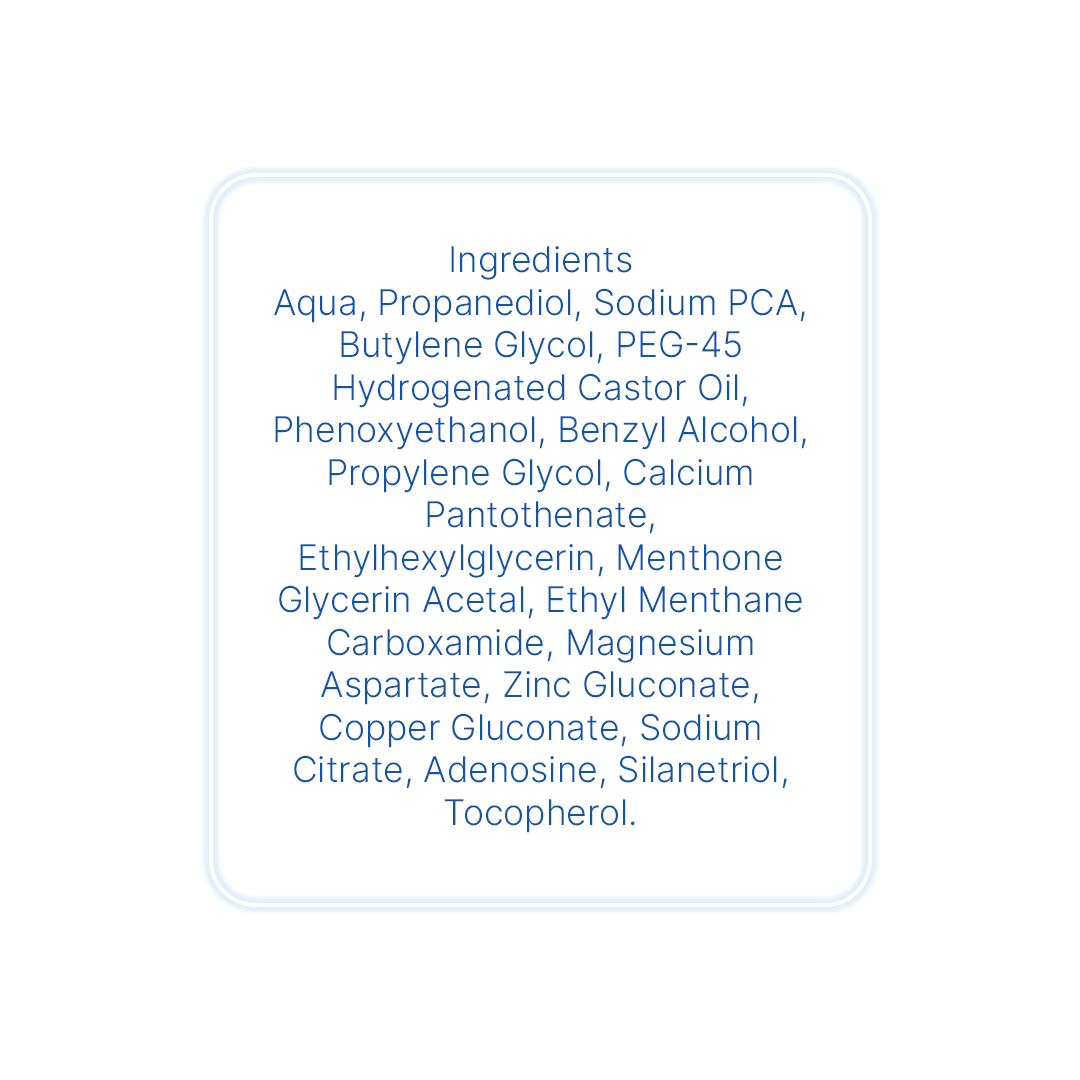 Aqua, Propanediol, Sodium PCA, Butylene Glycol, PEG-45 Hydrogenated Castor Oil, Phenoxyethanol, Benzyl Alcohol, Propylene Glycol, Calcium Pantothenate, Ethylhexylglycerin, Menthone Glycerin Acetal, Ethyl Menthane Carboxamide, Magnesium Aspartate, Zinc Gluconate, Copper Gluconate, Sodium Citrate, Adenosine, Silanetriol, Tocopherol.
