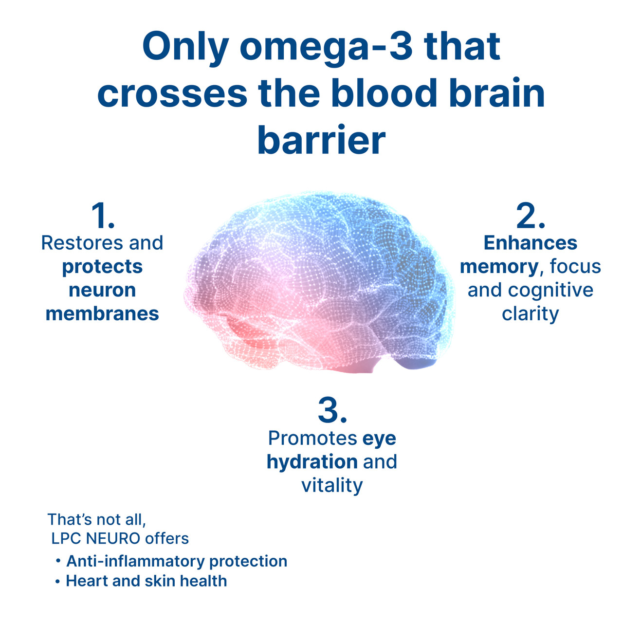 As we age, oxidative stress damages the membranes of the brain's neurons, causing cognitive decline, memory loss, and learning difficulties. Lysophosphatidylcholine-DHA and -EPA (LPC-DHA and LPC-EPA), trademarked as Lysoveta™, are groundbreaking omega-3 lipids that support brain health and slow cognitive ageing. It is the active ingredient in LPC Neuro.