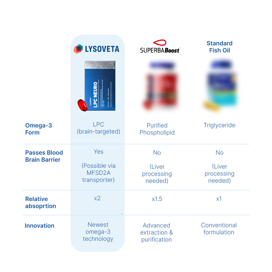 - Blood-Brain Barrier Penetration: Unlike standard omega-3s, Lysoveta™ is already in its final form for direct delivery to the brain, crossing the blood-brain barrier via the Mfsd2a protein.