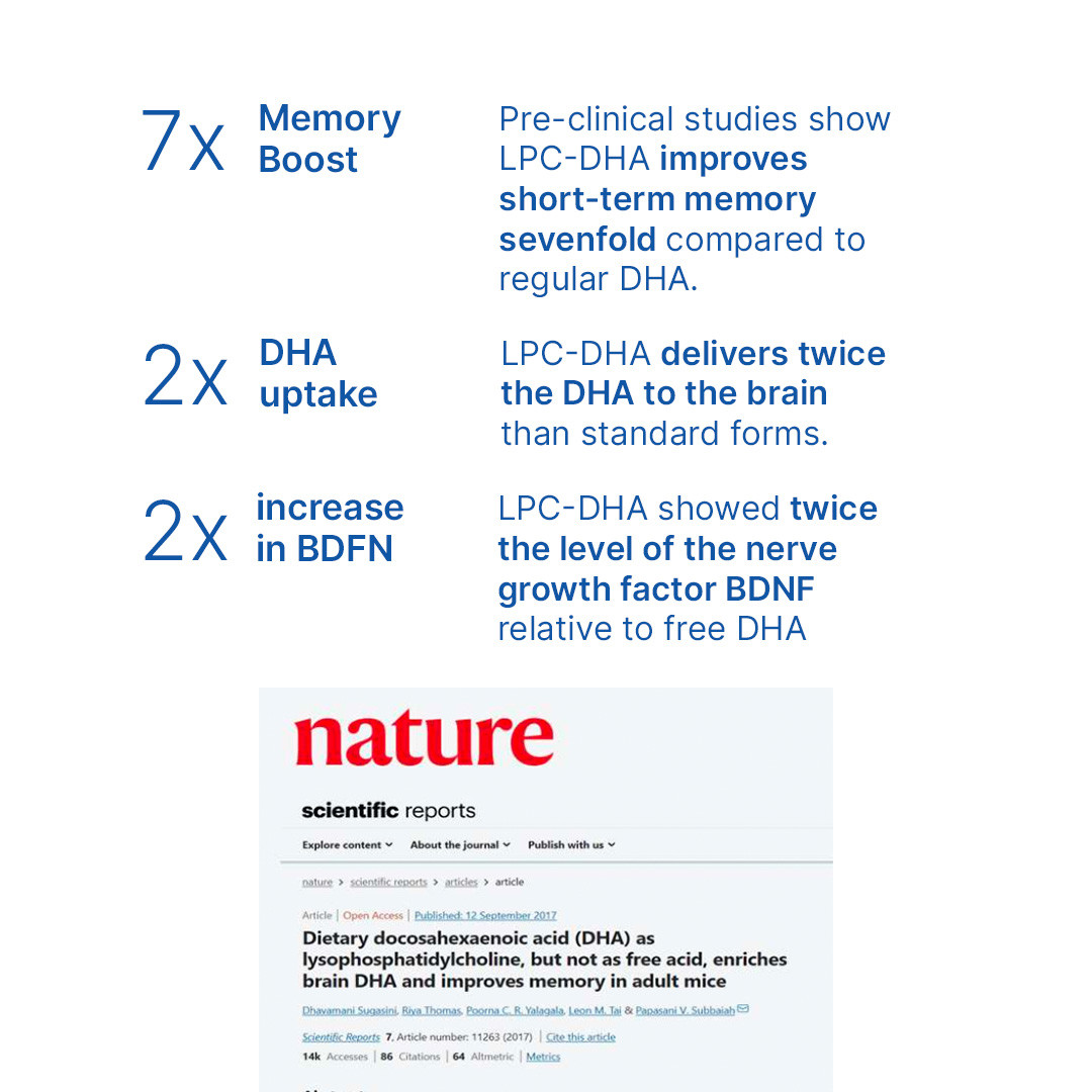 As we age, oxidative stress damages the membranes of the brain's neurons, causing cognitive decline, memory loss, and learning difficulties. Lysophosphatidylcholine-DHA and -EPA (LPC-DHA and LPC-EPA), trademarked as Lysoveta™, are groundbreaking omega-3 lipids that support brain health and slow cognitive ageing. It is the active ingredient in LPC Neuro.