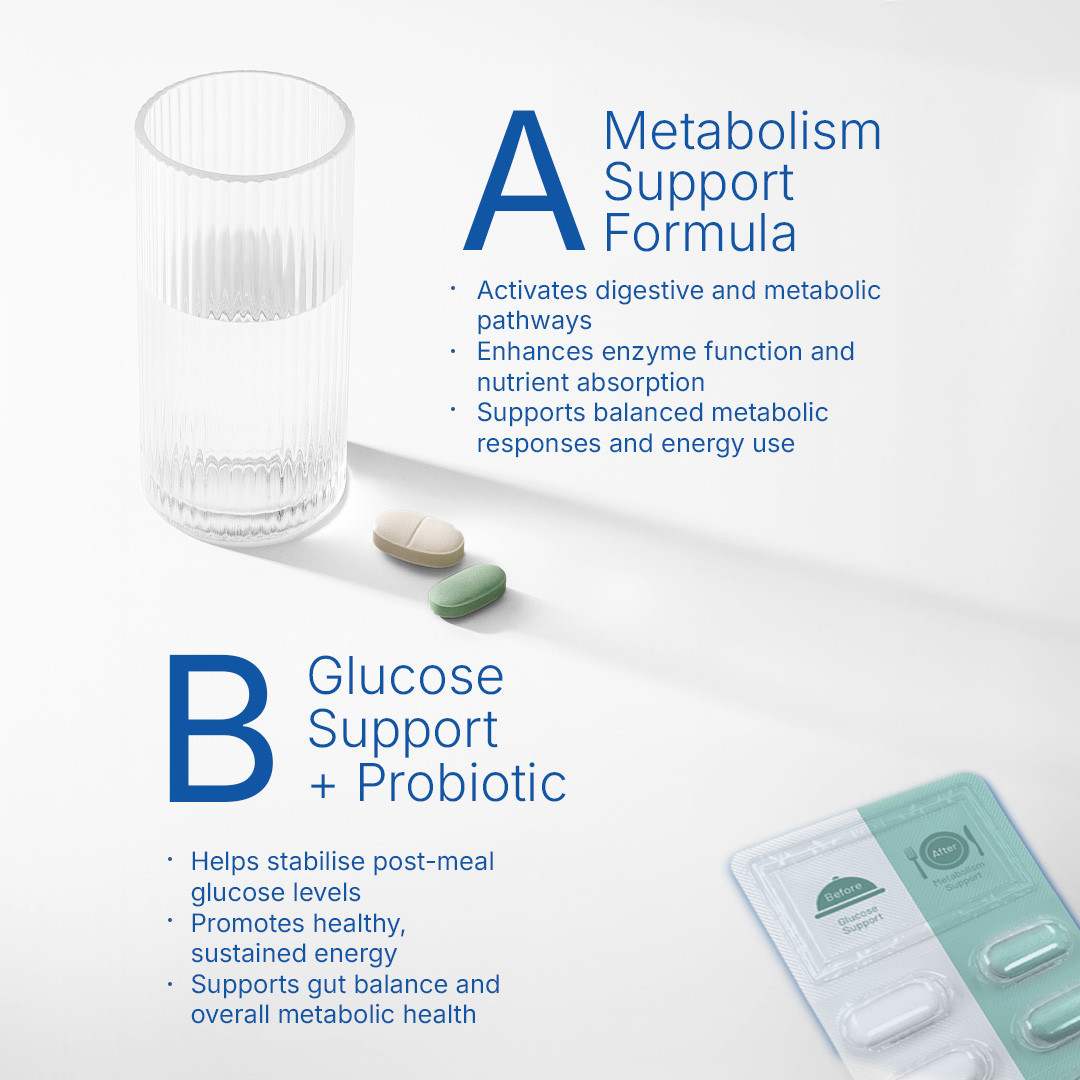 It pairs two coordinated tablets – one before your meal, one after – combining traditional Korean botanicals and key nutrients tailored to each phase. These work with the body’s natural metabolic rhythms and processes, helping to support and maintain balanced post-meal responses and a healthy gut environment, for digestive well-being, regularity and efficiency.