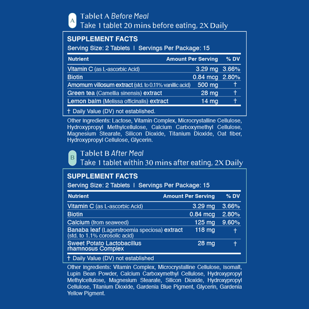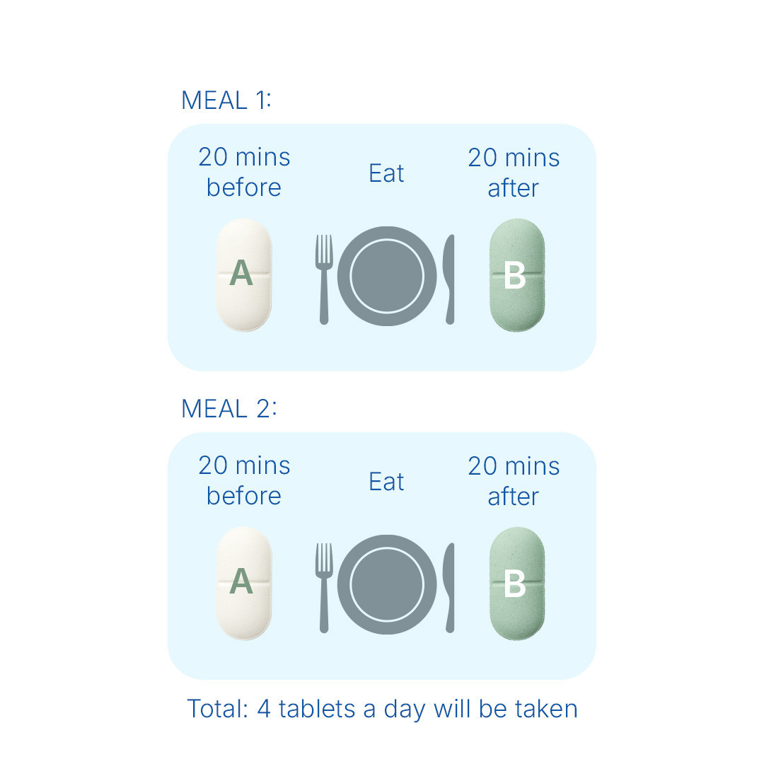 • Dual-Phase Formula: Tablet 1 before meal, Tablet 2 after meal
