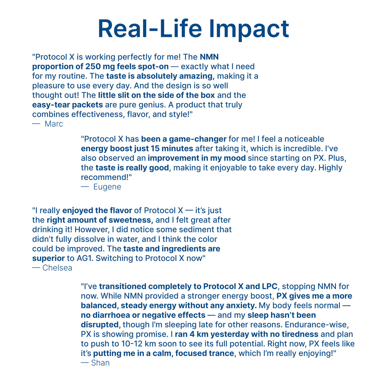 Protocol X™ stands out due to its comprehensive formulation that evolves with scientific advancements. The inclusion of clinically effective doses of hand-picked, science-backed ingredients ensures optimal efficacy. Additionally, the product is developed by a dedicated Scientific Advisory Committee, ensuring it remains at the forefront of longevity-enhancing nutrition.